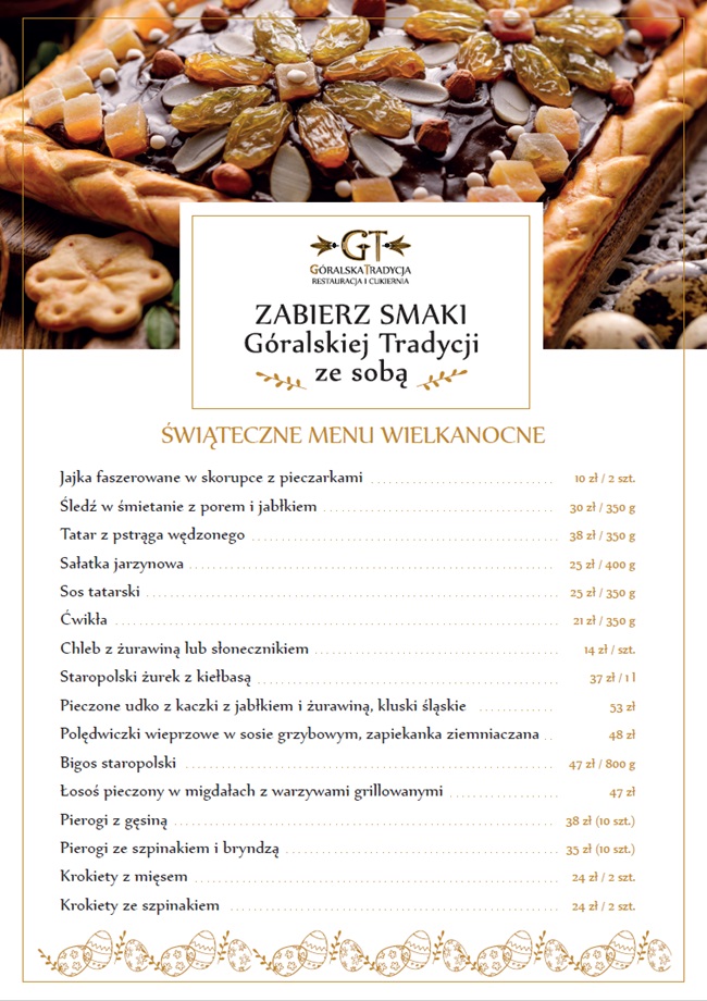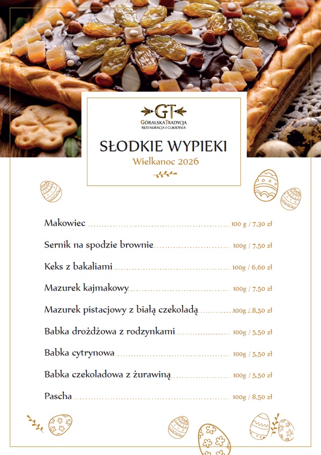 Publication Date: 30-03-2026 Zapraszamy do naszej Świątecznej Spiżarni 30-03-2026 Nasze najlepsze specjały, na Twój wielkanocny stół. read more> Walentynki w Góralskiej Tradycji 09-02-2026 Zapraszamy na walentynkową kolację w Góralskiej Tradycji. read more> Kolacja Sylwestrowa 22-12-2025 Powitaj z nami Nowy Rok! read more> Godziny otwarcia w okresie świąt 22-12-2025 read more> Wigilia w Góralskiej Tradycji 14-11-2025 Nie ma nic piękniejszego niż Wigilia spędzona w gronie najbliższych, przy doskonałych świątecznych potrawach, w wyjątkowej atmosferze, w jednej z najpiękniejszych restauracji w Zakopanem! read more> Bachleda Festiwal Restauracji z Góralską Tradycją 06-10-2025 read more> Nowy Taras Widokowy 01-08-2025 read more> Góralska Tradycja w Festiwalu Restauracji Bachleda! 01-05-2025 read more> Ciastko + Kawa = Promocja! 25-03-2025 Zapraszamy do naszej kawiarni na duet idealny! read more> TORTY KOMUNIJNE 17-03-2025 Przyjmujemy zamówienia na torty komunije. read more> Zapraszamy na Menu Testing 22-05-2024 Nowość! Menu Testing to wyjątkowa propozycja dla tych, którzy chcieliby spróbować naszej kuchni. read more> GRAND AWARD - 5 widelców od "Poland 100 Best Restaurants" dla restauracji Góralska Tradycja 20-05-2024 Nasza restauracja została wyróżniona aż 5-cioma widelcami w tegorocznej edycji plebiscytu "Poland 100 Best Restaurants"! read more> Góralska Tradycja dołącza do partnerów programu "Zakopiańska Karta Mieszkańca" 15-05-2024 Zapraszamy mieszkańców Zakopanego w nasze progi! Za okazaniem Zakopiańskiej Karty Mieszkańca otrzymają Państwo specjalną ofertę! read more> Nasza Szefowa Kuchni w finale Bocuse d’Or Poland 2023! 16-06-2023 Najbardziej prestiżowego kulinarnego konkursu indywidualnego na świecie! read more> Nasza cukiernia na liście najlepszych na świecie! 30-09-2022 Góralska Tradycja na liście najlepszych cukierni w Polsce w ogólnoświatowym rankingu La Liste. read more> Dziękujemy za wyróżnienie! 06-07-2022 Miło nam poinformować, że Góralska Tradycja została doceniona przez Twój Styl. read more>